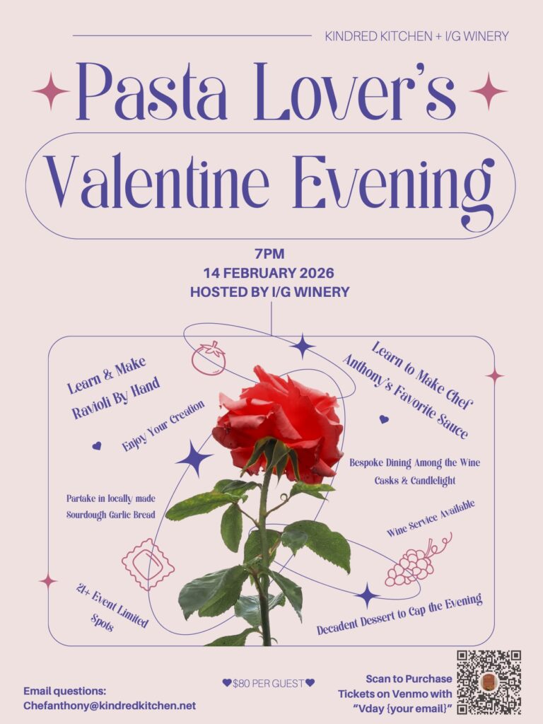 Celebrate Valentine’s Day with an intimate, chef-led pasta experience among candlelight and wine barrels at I/G Winery. Hosted by Kindred Kitchen, this hands-on evening invites guests to craft fresh cheese ravioli from scratch before sitting down to a two-pasta Italian dinner.